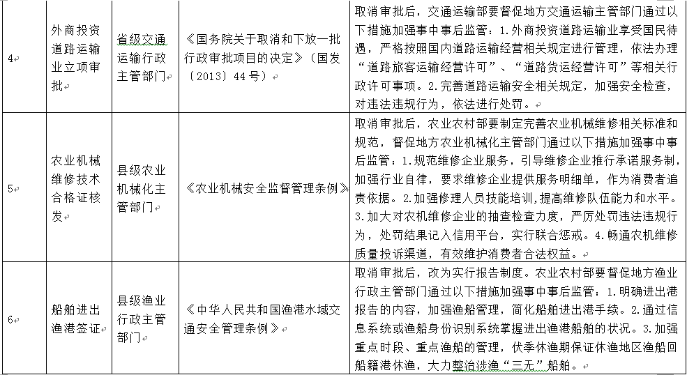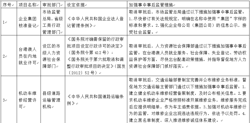 各省、自治区、直辖市人民政府,国务院各部委、各直属机构: 经研究论证,国务院决定取消11项行政许可等事项,现予公布。另有6项依据有关法律设定的行政许可事项,国务院将依照法定程序提请全国人民代表大会常务委员会修订相关法律规定。对取消的行政许可等事项,相关部门要制定完善事中事后监管细则,自本决定发布之日起20个工作日内按规定向社会公布,并加强宣传解读、确保落实到位。