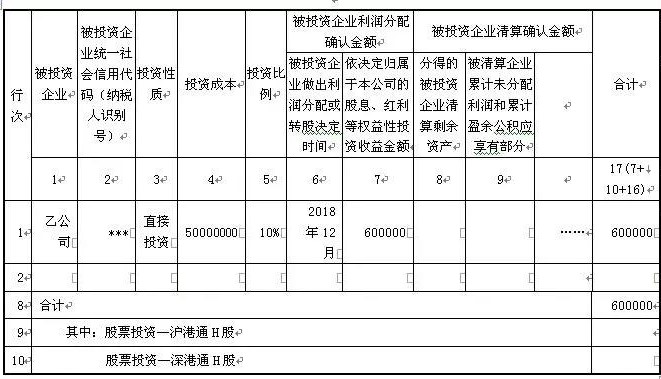 (2)企业所得税处理:2018年度企业所得税汇算清缴时,将600000元投资收益填入主表、附表A107010《免税、减计收入及加计扣除优惠明细表》第3行和A107011《符合条件的居民企业之间的股息、红利等权益性投资收益优惠明细表》的相关栏次,进行纳税调减处理。