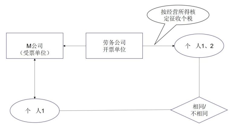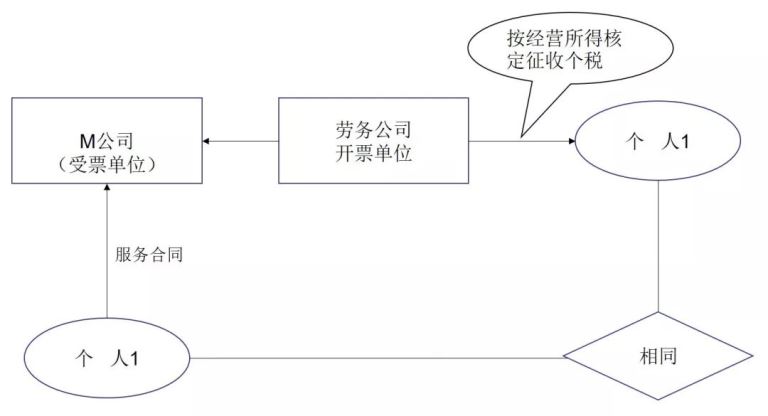 某些劳务公司在一些地方得到了政策,即劳务公司给个人发放报酬,可以按经营所得进行核定征收,税率最高在3.5%,每月金额小甚至在0.6%——1.8%左右。此时,部分公司为了规避个税基数和社保基数不一致的问题,M公司只就愿意缴纳社保的工资给个人发放工资,剩余的通过劳务公司以代发业务费用的形式支付给个人,劳务公司按经营所得核定征收扣税后发放给个人,此时,劳务公司向个人支付剩余金额中,有些这些个人和M公司发放工资的个人是同一人,有些可能就是劳务公司自己找的人,实际和M公司发放公司的个人不一致。