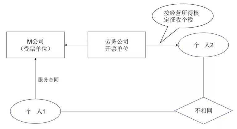 这一类主要是M公司和个人之间不是雇佣的劳动合同关系,而是服务合同关系,比如M公司找个人为其提供临时的装卸搬运服务、打井服务、临时演员服务等。当然,有些个人提供的服务本身就属于经营所得,而有些服务可能属于劳务报酬,直接在当地开票代扣税太高,且年度终了还要按综合所得合并纳税。因此,M公司会通过劳务公司以代发业务费用形式给个人,由劳务公司支付给个人时,直接按经营所得核定征收,税负大幅下降。