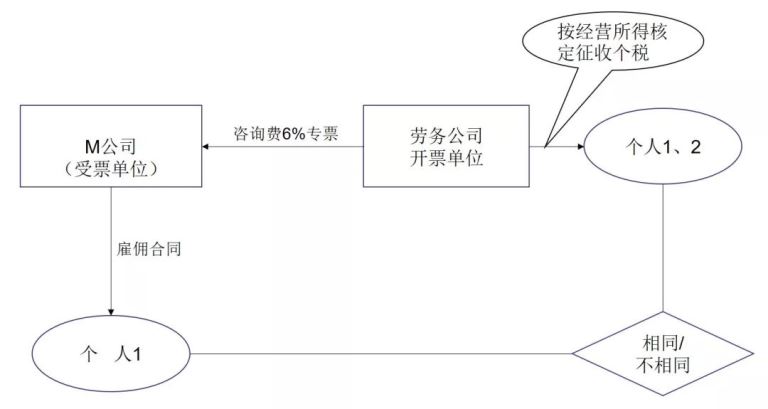 这种类型的筹划中,和M公司签订服务合同的个人往往和劳务公司实际代发费用并代扣个税的个人是一致的。这一类交易从宽来看,可以不按虚开来定性。但是,我们提醒企业注意的是: