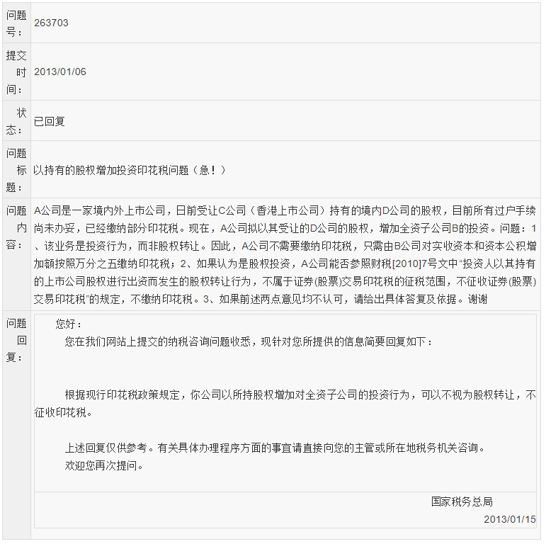 同时需要注意的是,由于股权作价投资涉及到工商部门变更登记,而在工商部门进行变更登记时,需要按照工商部门的格式合同提交相关资料,其中包括工商部门提供的《股权转让合同》,需在合同中列明涉及变更的股权比例、对价等要素,而印花税属于行为税,只要发生了应税行为就产生了纳税义务,因此该格式合同的签订同样表明股权作价增资行为中发生了印花税的纳税义务,应当缴纳印花税。 观点二:不属于列明的应税行为,不缴纳 以股权作价增资的行为本质上属于一种投资行为,不应当作为股权转让行为征收印花税。参考《关于以上市公司股权出资有关证券(股票)交易印花税政策问题的通知》(财税〔2010〕7号)的规定,投资人以其持有的上市公司股权进行出资而发生的股权转让行为,不属于证券(股票)交易印花税的征税范围,不征收证券(股票)交易印花税。且国家税务总局网站曾经做出相关答复,明确了股权作价增资行为不缴纳印花税,答复截图如下: