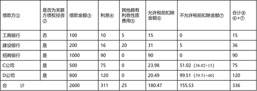 3、向境内关联企业C公司贷款,C企业实际税负为18%,低于该工业企业。同时根据企业的资料,税务机关进一步确认其高债资比例不符合独立交易原则,因此其超过部分利息支出36.02万不允许税前扣除