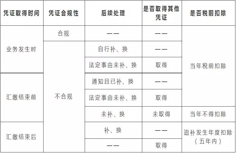 (二)汇缴结束前未取得合规凭证,之后依法取得或者依法取得替代凭证,仍然可以税前扣除。(新亮点)