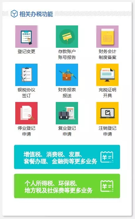 另外上面有两个功能“增值税、消费税、发票、套餐办理、金融街等更多业务”和“个人所得税、环保税、地方税及社保费等业务”,点击后可以进入原国税、地税的电子税务局界面。 本文转自办税总动员公众号,版权归原作者所有,如有不妥请联系处理。 |