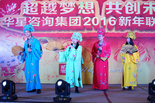 年度表彰大会结束后,华星新年联谊会正式开始。华星咨询集团董事长及全体工作人员和家属在喜庆、祥和、热烈的氛围******聚一堂,主持人沈俊杰、王呈玉、李权、史翠四人登场,华星新年联谊会拉开帷幕。