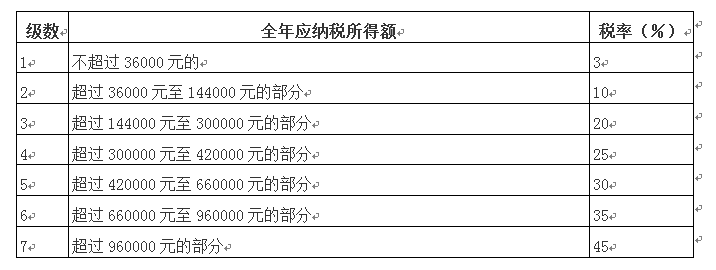 注2:非居民个人取得综合所得依照本表按月换算后计算应纳税额。)(注1:本表所称全年应纳税所得额是指依照本法第六条的规定,居民个人取得综合所得以每一纳税年度收入额减除费用六万元以及专项扣除、专项附加扣除和依法确定的其他扣除后的余额。