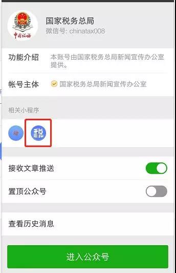 第一步:关注“国家税务总局微信公众号,找到关联小程序。