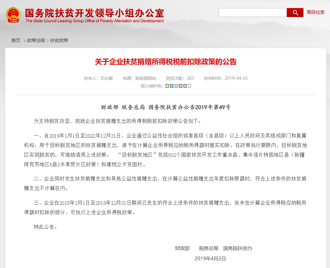 三部门:企业扶贫捐赠支出准予税前据实扣除