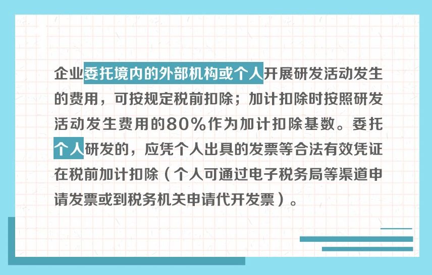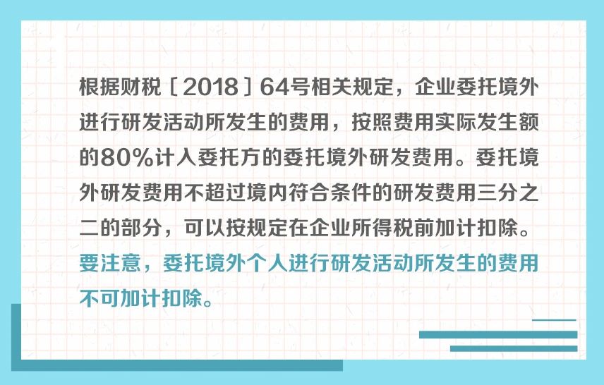 近年来,研发费用加计扣除政策持续优化完善,呈现出年年加力、步步扩围、层层递进的特点,对支持企业投入研发、鼓励科技创新起到重要作用。为帮助纳税人全方位学习了解相关政策规定,我们制作了“研发费用加计扣除政策系列图解”。今天带你了解:企业委托研发费用的有关规定↓