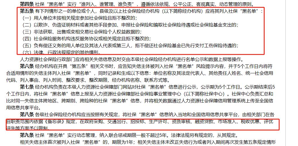 2018年10月16日,人社部官网发布《社会保险领域严重失信“黑名单”管理暂行办法(征求意见稿)》。 征求意见稿中明确“黑名单”是指违反社会保险相关法律、法规和规章的用人单位、社会保险服务机构及其有关人员、各类参保及待遇领取人员严重失信记录信息。 人社部拟要求有以下六种情形之一的单位或个人,县级及以上社会保险经办机构应将其列入社保“黑名单”: