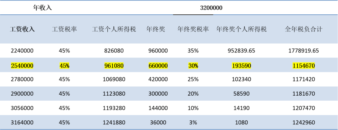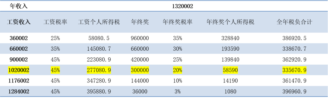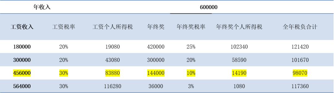 案例二 假设全年收入1320002元(为方便讨论,假设这个数额已经是扣除了6万费用、专项扣除和其他扣除后的金额): ![]() 鉴于年终奖在960000元到660000元之间,年终奖税率还是高于工资税率,处于递减区间,这个肯定不是我们要找的区间。我们一定要在年终奖税率低于工资税率区间(递增区间)找,此时,我们发现,年终奖发300000元,个人所得税整体税负是最低的。 案例三 假设全年收入600000元(为方便讨论,假设这个数额已经是扣除了6万费用、专项扣除和其他扣除后的金额):