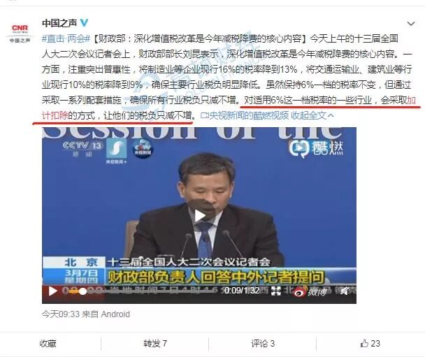 2019年3月5日,总理在政府工作报告中提出将16%的税率降为13%,10%的税率降为9%,但是6%的税率保持不变。2019年3月7日,财政部部长在回答记者提问时,提出对适用6%这一档税率的一些行业,会采取加计扣除的方式,让他们的税负只减不增。