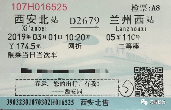 票面数据如下:票价:174.5元。 铁路旅客运输进项税额=票面金额÷(1+9%)×9%=174.5÷(1+9%)×9%=14.41元 。 【特别提示】铁路车票票面旅客身份信息需与报销人的身份信息一致。 适用要点四 取得注明旅客身份信息的公路、水路等其他客票的,按照公式计算进项税额 取得注明旅客身份信息的公路、水路等其他客票的,按照下列公式计算进项税额: 公路、水路等其他旅客运输进项税额=票面金额÷(1+3%)×3% 【案例4】