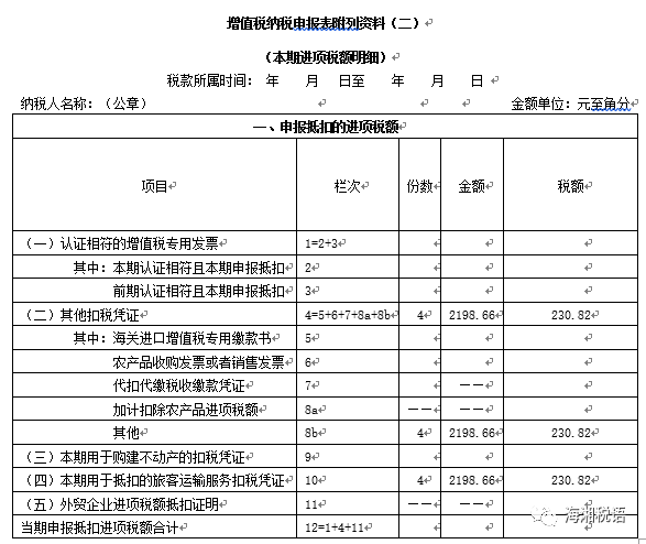 票面数据如下:票价:25元。 公路旅客运输进项税额=25÷(1+3%)×3%=0.73元 【特别提示】 1.公路、水路客票需有旅客身份信息的才可以计算抵扣进项税金;无旅客身份信息的客票,比如出租车票等不能抵扣进项税额。 2.票面旅客身份信息需与报销人的身份信息一致。 申报表填报示例 填报要点: 增值税纳税申报表附列资料(二) 《本期进项税额明细》 第10栏“(四)本期用于抵扣的旅客运输服务扣税凭证”:反映按规定本期购进旅客运输服务,所取得的扣税凭证上注明或按规定计算的金额和税额。 本栏次包括第1栏中按规定本期允许抵扣的购进旅客运输服务取得的增值税专用发票和第4栏中按规定本期允许抵扣的购进旅客运输服务取得的其他扣税凭证。 本栏“金额”“税额”≥0。 填报示例 上述四张票价合计金额:2198.66元 税额:230.82元,需要先填入第8b栏“其他”,再合计到第4栏“按规定本期允许抵扣的购进旅客运输服务取得的其他扣税凭证”。同时应分别按份数、金额和税额填写到第10栏“(四)本期用于抵扣的旅客运输服务扣税凭证”