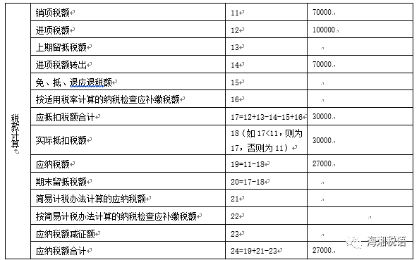 主表第19栏“应纳税额”:反映纳税人本期按一般计税方法计算并应缴纳的增值税额。 1.适用加计抵减政策的纳税人,按以下公式填写。 本栏“一般项目”列“本月数”=第11栏“销项税额”“一般项目”列“本月数”-第18栏“实际抵扣税额”“一般项目”列“本月数”-“实际抵减额”; 适用加计抵减政策的纳税人是指,按照规定计提加计抵减额,并可从本期适用一般计税方法计算的应纳税额中抵减的纳税人(下同)。“实际抵减额”是指按照规定可从本期适用一般计税方法计算的应纳税额中抵减的加计抵减额,对应《附列资料(四)》第6行“一般项目加计抵减额计算”、的“本期实际抵减额”列。 主表第19栏“应纳税额”=70000-30000-13000=27000元