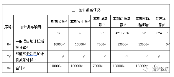 学习笔记: 【案例5】某企业符合加计抵减政策规定相关条件,2019年6月应纳税额为3万元,加计抵减额为4万元。2019年7月销项税额7万元,进项税额为10万元,进项转出税额7万元。实际抵扣税额3万元。 解析:2019年6月以当期可抵减加计抵减额抵减应纳税额至零。未抵减完的当期可抵减加计抵减额1万元,结转7月继续抵减。 2019年7月当期计提加计抵减额=10万元*10%=1万元,当期调减加计抵减额=7万元*10%=0.7万元 当期可抵减加计抵减额=上期末加计抵减额余额+当期计提加计抵减额-当期调减加计抵减额=1+1-0.7=1.3万元 申报表填报示例: